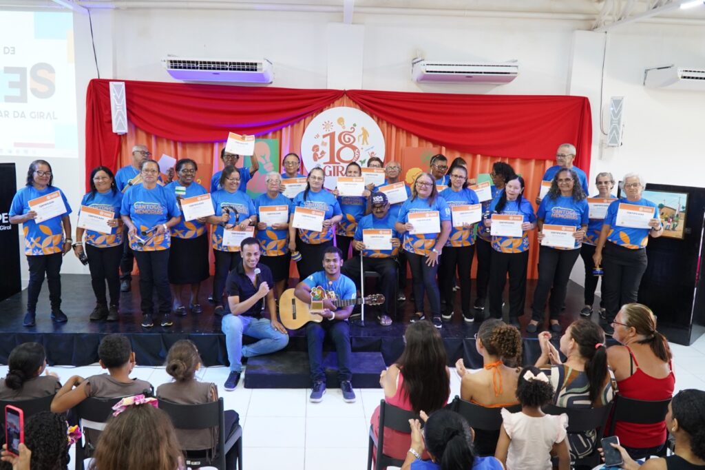 A sede da Giral se encheu de alegria na última quinta-feira, 12 de dezembro, com a culminância dos projetos Sonhos Não Envelhecem e Vida Feliz. Reunindo participantes para celebrar tudo o que foi construído ao longo de 2025, o evento teve uma abertura emocionante do grupo Cantos e Memórias e contou com a presença de turmas de Apoti e Pombos, além da formatura do curso de Cuidador de Idosos. Foi uma manhã de histórias compartilhadas, talentos descobertos e a certeza de que nunca é tarde para recomeçar. “Que esse palco seja sempre a liberdade de ser quem nós somos. E isso nos dá alegria, reconhecimento”, declarou Everaldo Costa, fundador da Giral. Em sua fala, o fundador incentivou as participantes a terem orgulho de suas histórias e a construírem seus caminhos com alegria. “Porque ainda há tempo!”, enfatizou. Everaldo também conectou o trabalho da organização a um propósito maior: “O que a gente faz a gente faz com muito amor”, disse, reafirmando a missão da Giral de promover cuidado e dignidade em todas as fases da vida. Os projetos Sonhos Não Envelhecem e Vida Feliz atendem pessoas idosas a partir dos 60 anos, tanto da área rural quanto urbana, que buscam acesso à cultura, educação e convivência. “Os projetos atendem 120 pessoas idosas, homens e mulheres, que veem no projeto uma oportunidade”, explica Robervânia Costa, coordenadora. Ela destaca que as iniciativas entendem o envelhecimento como um processo dinâmico e oferecem oficinas de letramento digital, ludicidade, artesanato, corte e costura, prática esportiva, orientações à saúde, rodas terapêuticas, musicalização e dança cultural. “São pessoas que estão enxergando nos projetos a oportunidade de reviver e de acordar seus sonhos”, afirma. As histórias de transformação são muitas e profundas. Dona Terezinha Gomes, de Apoti, começou como beneficiária do projeto e se tornou professora da turma, dando oficinas de fuxico. “Antes do fuxico, eu tomava medicação pra dormir. Depois da ‘fuxicada’ eu durmo tranquila”, revela. Seu caso exemplifica como o projeto desperta talentos e abre possibilidades de novas profissões na terceira idade. Ana Maria de Souza, participante da oficina de artesanato, conta sua evolução: “Eu não tinha coordenação motora, fazia tudo torto, mas fui melhorando. Quase no fim eu comecei a ajudar minhas colegas”. Para ela, o ano foi marcado por amizades e novos encontros que trouxeram leveza ao cotidiano. Tereza Cristina, da oficina de dança, resume o impacto do projeto em uma frase: “A Giral na minha vida foi um reinício da minha história”. Ela vivia com dores, deprimida, dentro de casa e sem perspectiva, lidando com depressão e ansiedade. “Agradeço pelo amor e carinho, porque na Giral eu encontrei amigos que me deram atenção, me acolheram e cuidaram de mim”, declarou emocionada. Histórias como a de Dona Tereza mostram que o projeto vai além das oficinas, criando redes e laços fundamentais para o envelhecimento ativo e saudável. Robervânia destaca que muitas participantes eram agricultoras ou exerciam outros ofícios e descobriram no projeto uma nova profissão, conseguindo gerar renda. “Além de gerar renda, elas se sentem úteis, sentem que o seu trabalho é reconhecido e valorizado”, afirma. A coordenadora enfatiza que o saber popular é muito valorizado no projeto e que a fase da velhice precisa ser enxergada com afeto, amor e respeito. A parceria com o Conselho do Idoso tem sido fundamental para viabilizar o acesso a essas oportunidades, fortalecendo a rede de proteção e cuidado com a pessoa idosa no território. O evento encerrou com todas as participantes cantando juntas “É preciso saber viver”, em um momento de emoção e celebração coletiva. A culminância dos projetos Sonhos Não Envelhecem e Vida Feliz deixou claro que envelhecer pode ser uma experiência de redescoberta, aprendizado e alegria quando há espaços que acolhem, respeitam e valorizam cada história. Como reforçou Everaldo Costa, ainda há tempo para construir novos caminhos: com dignidade, afeto e a liberdade de ser quem se é. As iniciativas realizadas pela Giral contam com o patrocínio da BB Seguros, BTG Pactual, Electrolux Group, SulAmérica, Instituto Ultra, Alura, Perfect Automotive, Grupo Sabará, Cia Muller e apoio do Programa Parceiro do Idoso – Santander.