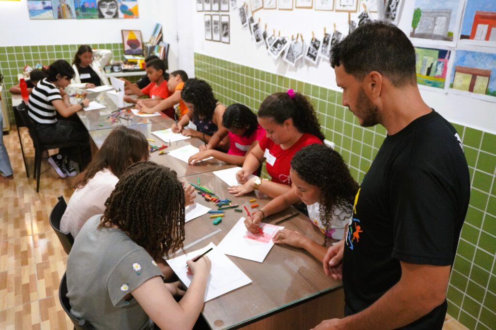No último dia 15 de julho, enquanto parte da cidade descansava em pleno recesso escolar, os jovens artistas do Paleta Coletiva caminhavam por uma trilha rumo a uma experiência que criaria memórias afetivas importantes para o grupo. A aula de campo aconteceu no sítio onde mora a jovem artista Júlia Costa, na zona rural de Glória do Goitá. Uma oportunidade de estreitar laços e exercitar a arte em sua forma mais pura. “O percurso até acabou fazendo parte da experiência”, lembra Wemisson Araújo, educador responsável pelo grupo. “Já que, devido às chuvas e ao terreno íngreme, o carro não conseguiu subir até a residência, então caminhamos juntos”, completou. Ao longo do dia, os adolescentes observaram os elementos naturais e arquitetônicos da propriedade e produziram desenhos ao ar livre, registrando o ambiente com a sensibilidade de quem entende que arte e afeto caminham juntos. A anfitriã do encontro, Júlia Costa, viveu o dia com alegria incontida. “Eu acordei tão feliz que era capaz de explodir. Mal consegui dormir de tanta ansiedade por saber que meus amigos vinham aqui. Foi muito supimpa receber todo mundo”, contou, já fazendo planos para um próximo encontro. E, pr’além de um exercício técnico a aula de campo se tornou um espaço de conexão e escuta. Entre desenhos e observações, o grupo compartilhou histórias, emoções e brincadeiras. “Foi um momento de desconexão com a agitação do dia a dia, uma desconexão de tudo aquilo que acaba nos causando estresse e ansiedade”, afirmou a artista Lohana Farias. “O contato com a natureza, que nos faz tão bem, o contato sentimental com as pessoas, a forma com que cada um deixou-se cativar e ser cativado, foi um momento descontraído e excepcional.” Para Wemisson, essa vivência reforça o papel do Paleta Coletiva como um espaço de criação artística comprometido com o território e com as subjetividades dos jovens. “A escuta, o cuidado e a convivência são partes fundamentais do nosso processo. O que aconteceu nesse dia não se ensina em sala.” O Paleta Coletiva é um grupo de jovens artistas formado a partir do projeto Educação e Vivências Inclusivas, da Giral. Através da pintura, os adolescentes pesquisam, recriam e registram a cultura, as paisagens e o cotidiano do território onde vivem, fortalecendo sua identidade e expressão. O projeto é realizado com apoio do Programa Amigo de Valor, do Santander, e promove o desenvolvimento integral de crianças e adolescentes, com foco em formação cidadã, cultural e política, especialmente em contextos de vulnerabilidade social.
